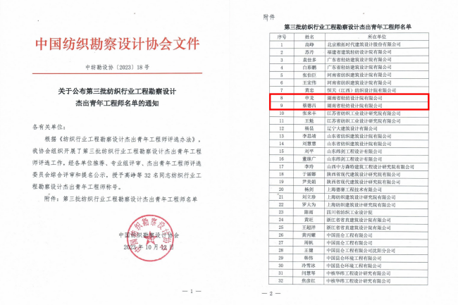 喜訊 | 湘咨集團(tuán)所屬省輕紡院兩名專家 榮獲“紡織行業(yè)勘察設(shè)計(jì)杰出青年工程師”稱號(hào) |