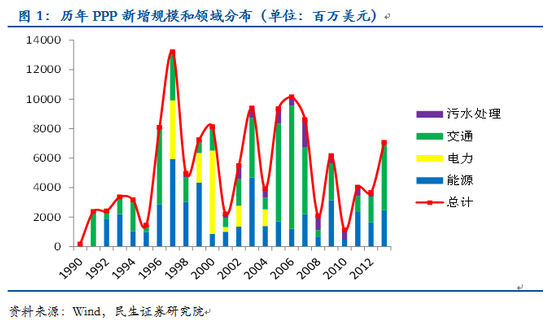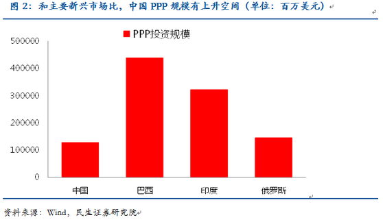 根據(jù)國(guó)務(wù)院研究發(fā)展中心的測(cè)算,到2020年,與城鎮(zhèn)化相關(guān)的融資需求約為42萬(wàn)億元。根據(jù)43號(hào)文和《地方政府存量債務(wù)納入預(yù)算管理清理甄別辦法》的規(guī)定推演,未來(lái)地方政府性債務(wù)主要由一般政府債、專項(xiàng)政府債和PPP債構(gòu)成。可見,應(yīng)對(duì)未來(lái)幾十年城鎮(zhèn)化的資金缺口,PPP模式被委以了重任。 從43號(hào)文規(guī)定來(lái)看,對(duì)于新增政府債務(wù),推廣使用政府與社會(huì)資本合作模式。鼓勵(lì)社會(huì)資本通過(guò)特許經(jīng)營(yíng)等方式,參與城市基礎(chǔ)設(shè)施等有一定收益的公益性事業(yè)投資和運(yùn)營(yíng)。對(duì)于存量政府債務(wù),在建工程確實(shí)沒有其他建設(shè)資金來(lái)源的,應(yīng)主要通過(guò)政府與社會(huì)資本合作模式和地方政府債券解決后續(xù)融資。 PPP模式具有較大的發(fā)展?jié)摿ΑR环矫妫?013年中國(guó)PPP項(xiàng)目的累計(jì)總投資為1278億美元,和同類型新興市場(chǎng)比有較大的差距。另一方面,2013年新增的PPP投資額僅為7億美元,而2013年城投債的發(fā)行量則高達(dá)9512億元,若PPP模式成功替代城投主導(dǎo)的融資模式,其發(fā)展空間巨大。