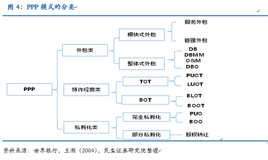 從廣義上來(lái)說(shuō),PPP指的是企業(yè)參與提供傳統(tǒng)上由政府獨(dú)自提供的公共產(chǎn)品或服務(wù)的模式。從世界銀行對(duì)PPP的分類來(lái)看,主要包括外包類、特許經(jīng)營(yíng)類和私有化類。因此,BOT本質(zhì)上也可視為是PPP的一種。 ![]()