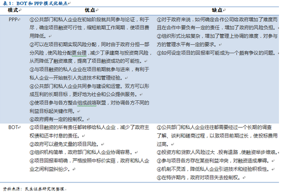 但從合作關(guān)系而言,BOT中政府與企業(yè)更多是垂直關(guān)系,即政府授權(quán)私企獨(dú)立建造和經(jīng)營(yíng)設(shè)施,而不是與政府合作,PPP通過(guò)共同出資特殊目的公司更強(qiáng)調(diào)政府與私企利益共享和風(fēng)險(xiǎn)分擔(dān)。 PPP的優(yōu)點(diǎn)在于政府能夠分擔(dān)投資風(fēng)險(xiǎn),能夠降低融資難度,雙方合作也能夠協(xié)調(diào)不同利益主體的不同目標(biāo),形成社會(huì)利益最大化,但缺點(diǎn)在于增加了政府潛在的債務(wù)負(fù)擔(dān)。BOT優(yōu)點(diǎn)在于政府最大可能的避免了項(xiàng)目的投資損失,缺點(diǎn)是投資風(fēng)險(xiǎn)大,私營(yíng)資本可能望而卻步,且不同利益主體的利益不同,單方面利益最大化的納什均衡并非全社會(huì)最優(yōu)。 ![]()